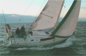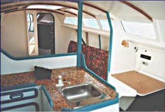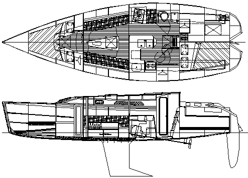 The separation between sleeping cabins makes her well suited to small family or two-couple cruising, with the settees serving as alternate berths for bad weather. The aft heads position is prefered by most women. The lazarette is large and has compartments for liferaft, gas and batteries.